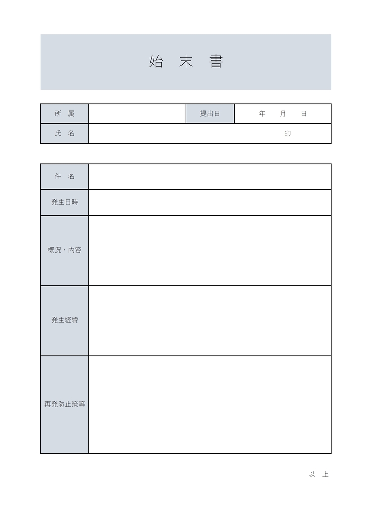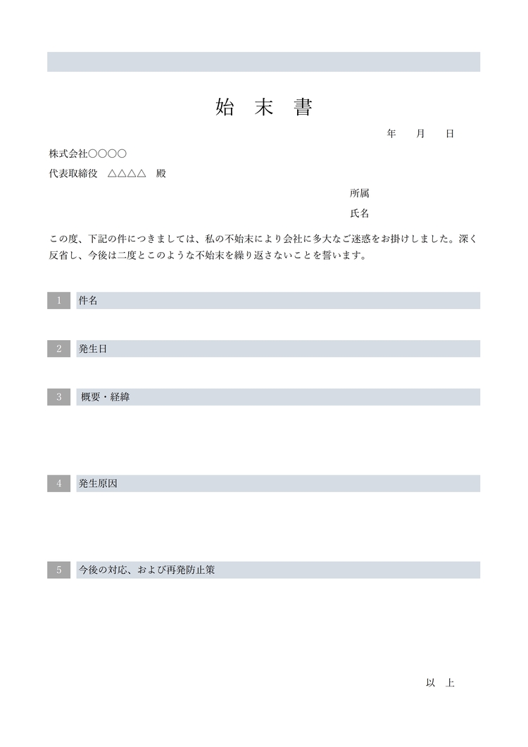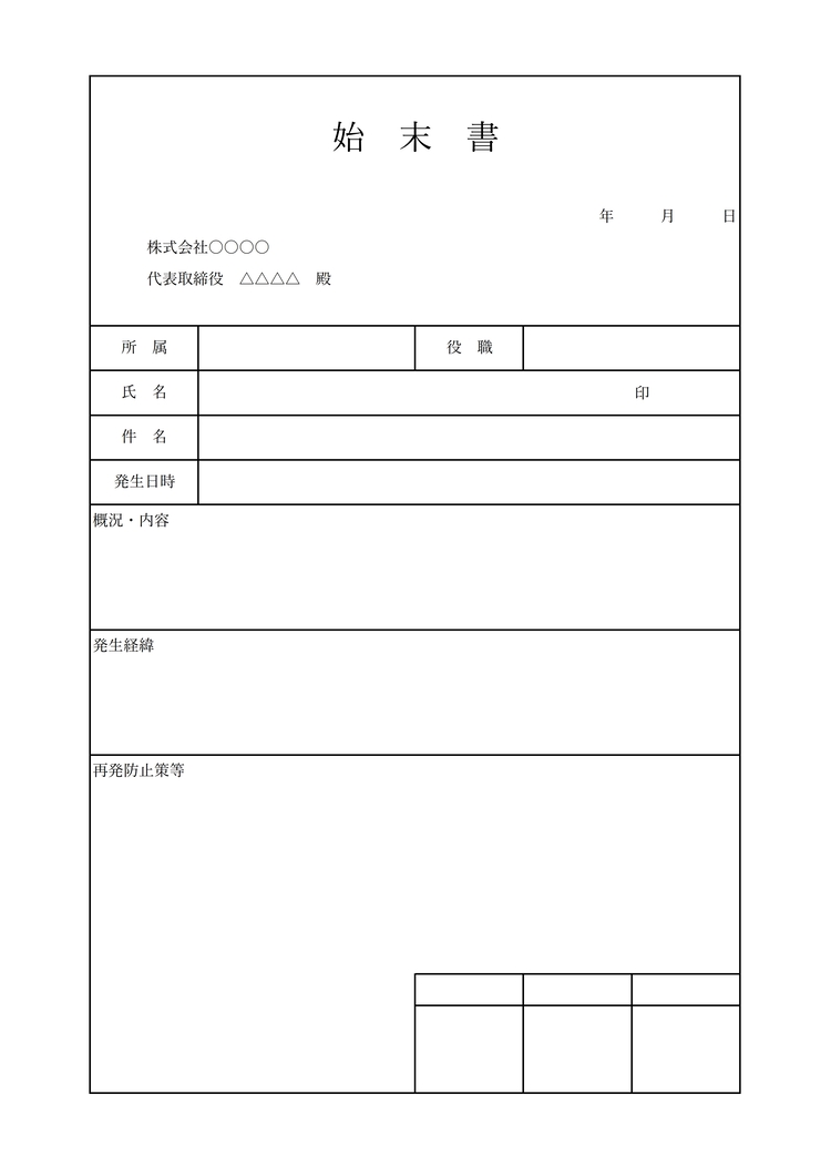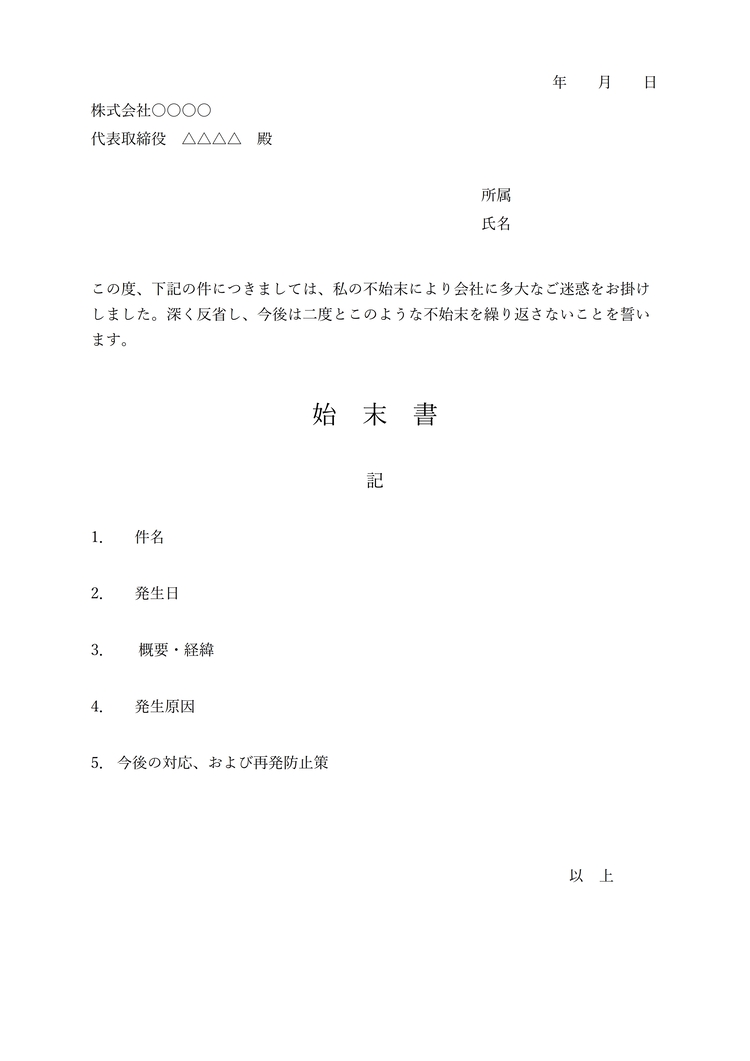 始末書の形式は会社によって多少異なりますが、一般的には次のような項目を記載します。